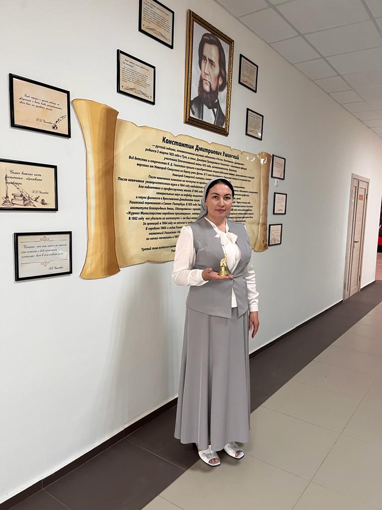 Памятный колокольчик передан Дирекцией Года педагога и наставника Министерства просвещения Российской Федерации МБОУ СОШ имени К.Д. Ушинского с. Мекен-Юрт" Надтеречного муниципального района Чеченской Республики.